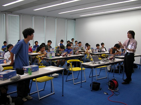 内容としては、ロボットの構成やシステムについての講義(第1回目)、製作(第2〜4回目)、コンテスト(第5回目)、総括(第6日目)という流れで、12人の子供が参加してくれました。